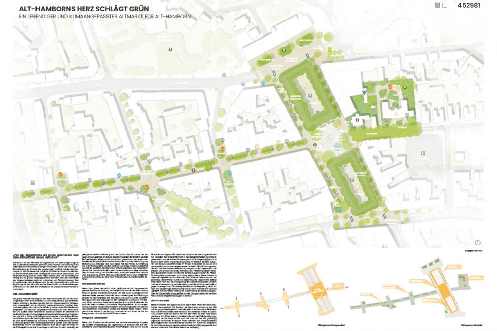 Der Entwurf für den Altmarkt, die Jägerstraße und Umgebung zielt darauf ab, Ordnung zu schaffen und das Gebiet aufzuwerten. Dabei wird auf die aktuellen Versiegelungen Rücksicht genommen, und Grünflächen werden gezielt integriert, um ein Gleichgewicht zwischen Nutzbarkeit und Ökologie zu schaffen. Für die Jägerstraße ist eine intensive Begrünung geplant, während am Altmarkt Baumlücken geschlossen und Baumreihen ergänzt werden, um das „Neue Herzstück“ sichtbar zu machen. Das „Neue Herzstück“ soll als zentraler Begegnungsort mit hoher Aufenthaltsqualität gestaltet werden. Die Platzfläche wird durch hellgraues Natursteinpflaster hervorgehoben, das die Parkplätze im Inneren einfasst. Der Platz wird mit einem Pavillon, einer Brunnenskulptur, einem Wasserspiel und Sitzbänken gestaltet, um eine einladende Atmosphäre zu schaffen. Ein schwebender Kronleuchter über dem Platz setzt einen besonderen Akzent. Der Markt bietet Platz für etwa 130 Stände, die in ihrer Länge übernommen wurden, mit großzügigen Durchgängen. Die Ränder des Platzes werden durch die Begrünung der Parkplätze und die Verbreiterung der Gehwege aufgewertet, um mehr Grün und Sitzgelegenheiten zu schaffen und die Aufenthaltsqualität zu erhöhen. Die Jägerstraße wird durch Begrünung, Entsiegelung und die Integration von Bäumen aufgewertet. Kreuzungen werden zu kleinen Piazzen mit Spielflächen und Bänken, was das Mikroklima verbessert und die Resilienz gegen Hitze und Starkregen stärkt. Die Beleuchtung wird an die neuen Grünräume angepasst, um Sicherheit zu gewährleisten. Im Westen der Jägerstraße liegt die VHS, die sich durch großzügige Grüninseln und Sitzgelegenheiten öffnet und so besser ins Stadtbild integriert wird. Für die Materialien wurde Natursteinpflaster für den Altmarkt, hochwertiger Betonstein für den Platzrand und Recyclingbeton für die Parkplätze gewählt. Das Mobiliar besteht aus robustem FSC-zertifiziertem Holz, und eine Wasserfläche mit Fontänen ergänzt das Konzept. Insgesamt baut das Gestaltungskonzept auf den bestehenden Qualitäten auf, hebt diese hervor und setzt neue Akzente, um die Aufenthaltsqualität zu verbessern und die Klimaresilienz zu stärken.